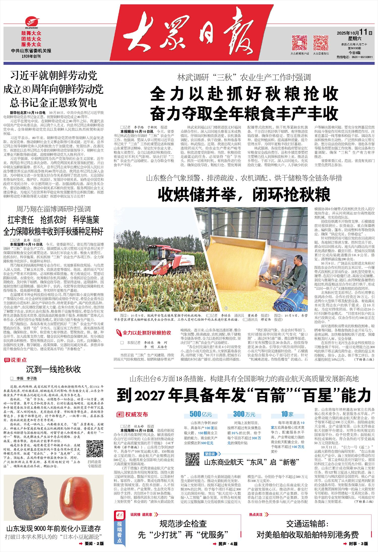 山东结合气象预警、防汛疏浚、农机扩容、粮食晒储等全链条措施,边收边晒、边储粮,闭环拾取秋粮。照片①:10月9日,肥城市安家庄镇朱家堰子村秋收景象。 。 。连日来,山东各地迅速部署,纳入气象预警、防洪排涝、粮农机具储粮、粮食储运等全链条措施,全力以赴“占颗粒收、颗粒定抗秋”。“亲爱的村民们,请注意!未来四小时雨势较小,适合小雨收割玉米。雨一停,大家就赶紧备好农具,下地干活。 10月7日凌晨,肥城市石横镇乡村广播电台“发出了循环的玉米收获信号。”我们联动气象、农业等部门实时变化时间。通过村级广播、微信群等渠道,发布30多条预警信息和20多条收获指南,指导农民抢占雨季、小雨等季节收割时机。”石横镇干部马艳才 农业综合服务中心。针对“机械入地难、农作物易断产”的痛点,石横镇协调6台履带式收获机在泥地里进行作业,并从河南调来22台高性能收获机械,充实收获队伍。仓促的采集和烘烤离不开物质的支撑。供销及农资商店,重点关注 燃料供应、编织袋、防水布、防雨塑料布等物资保障确保“供应充足、价格稳定”。党和干部群众对沟渠、田间渠、道路渠进行系统疏浚整治。截至目前,肥城市文阳镇已完成运河疏浚整治18.9公里,修复清理桥涵200多座。 10月9日,广饶县乐安街道北竹庚村干友农业合作社附近的玉米地里,履带式收割机冒雨作业。该机采用宽履带,可带泥连续移动,高效完成选穗、剥皮、收箱作业。随后,湿粮被送往合作社的一台同样配备有虫履带的拖拉机进行烘干,形成无缝闭环的“田间烘干场”。北竹庚村支部书记、合作社董事长张洪涛表示,合作社投资近70万元引进两座大型干燥塔及配套设备,有效满足村里及周边农户的干燥需求。 10月以来,针对持续降雨,干燥塔开始24小时不间断运行模式。 “目前,该村农民已经完成了玉米的收割和建设,只剩下100公顷左右的合作社还在收割。”面对持续降雨造成的秋粮收割困难、烘干困难等问题,各粮食物流企业紧锣密鼓地工作。它昼夜运转,加快粮食的发育和晒粮,确保秋季的及时入库、安全储藏。东营七龙河生态农业科技有限公司的粮食烘干,日处理能力300吨的烘干塔满负荷运转。然后湿玉米经过脱粒、筛分、去除、干燥等工序,含水率控制在14%以内。 “今年我们公司种植了4500公顷玉米,已经完成了近四分之一的产量。”该公司负责人郭立宝表示,在秋粮丰收的关键时刻,我们不仅要专注于自己的田地,还要为周边农民尽自己的一份力量。为解决“晒难”问题,利津县盐窝镇政府与公司合作,发起开放烘干设备,为周边小农户免费提供秋季粮食烘干服务。 10月9日下午,在位于汶上县的山东卓荣农业服务有限公司大院里,总经理陆阳首先引导卡车前往短绒装载粮食,随后指派装载机进行覆盖、装载物料。烘干后的粮食直接装上卡车,运往附近的深加工企业。 “随着建设作为济宁市日晒量最大的服务点,我公司提供粮食烘干、仓储、贸易等一站式农业服务。目前,我们每天收集50-60辆粮车。烘干范围覆盖济宁及周边地区、河南省。 ”陆阳表示,目前收购的玉米水分含量高达28%-35%,入库前一般干燥为14%。但为了提高干燥效率,他们暂时将干燥标准调整为15%-17%,干燥后的粮食不再储存,直接送到企业深加工。针对雨季造成的玉米生长、霉菌等情况,该公司近期投资 30万元新增颜色分级设备,并按类别采购,保证烘干质量。
